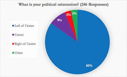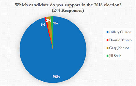 Secretary Clinton is the unequivocal first choice, netting 234 votes from the aggregate 246 participants in the survey. The vast majority of respondents identify with the political left. Thus, her victory was to be expected. However, the percentage of individuals supporting Clinton is higher than the combined totals of those who identify as left of center (85%) and center (8.5%). This suggests that Clinton’s support pulls from conservative areas of the political spectrum, indicating a broader range of support across Grounds than anticipated.